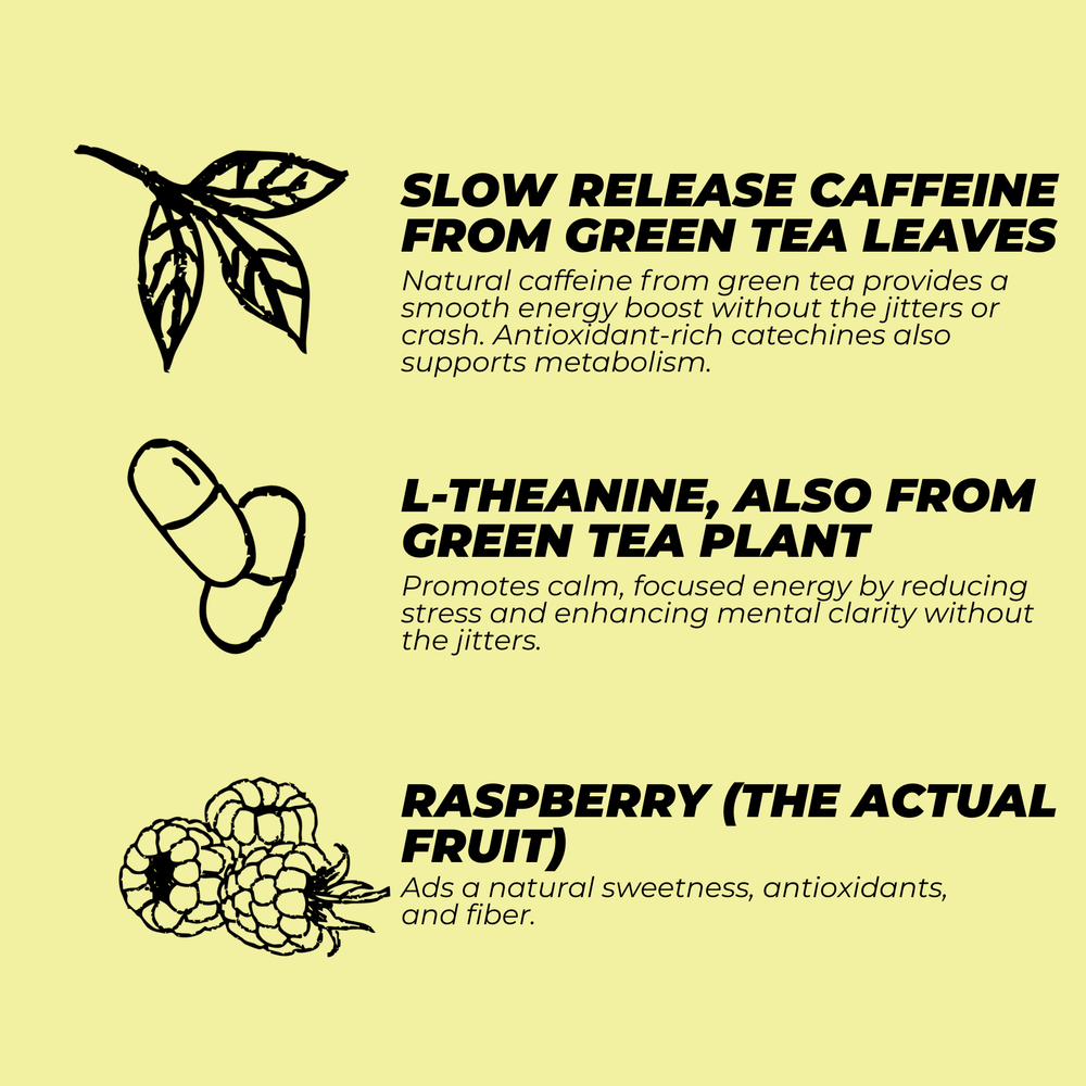 Our Sour Raspberry Energy Gummies are here to bring the perfect mix of tangy bite and smooth, long-lasting energy. Each gummy is powered by 100mg green tea caffeine, L-Theanine, and Cordyceps Mushroom for clean focus and endurance without the jitters or crash.